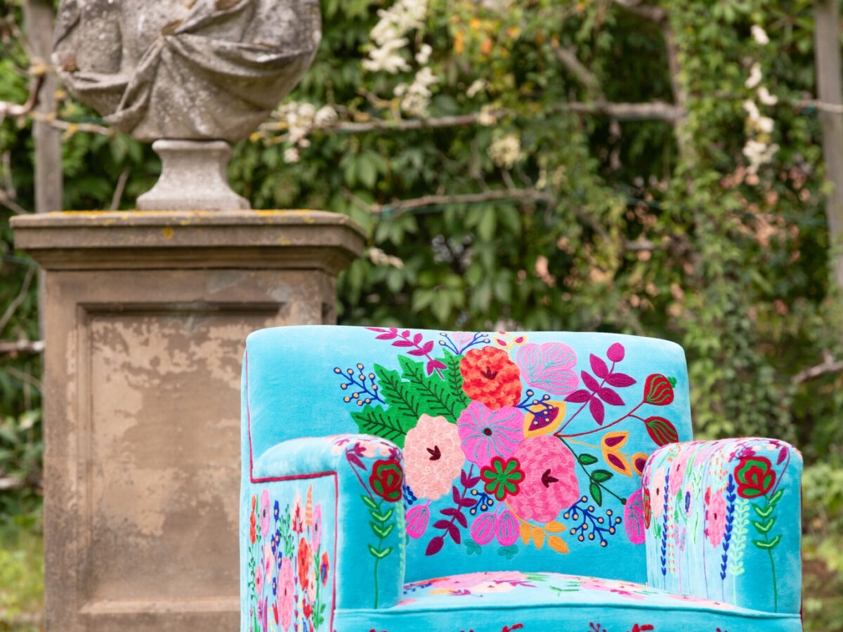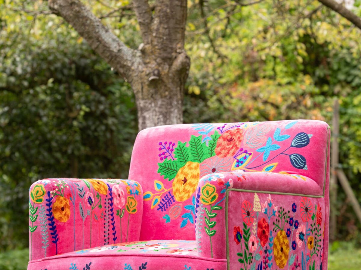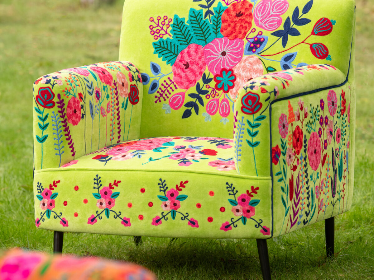 Deze oranje gekleurde, fluwelen zetel is versierd met prachtige geborduurde bloemen in allerlei kleuren op alle vlakken van de fauteuil. De randen zijn elegant afgewerkt met een roze bies. De zitting staat op vier zwarte houten poten. Een echte eye-catcher in het interieur!