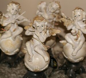 Set van 4 engeltjes: 2 hangend, 2 knielend